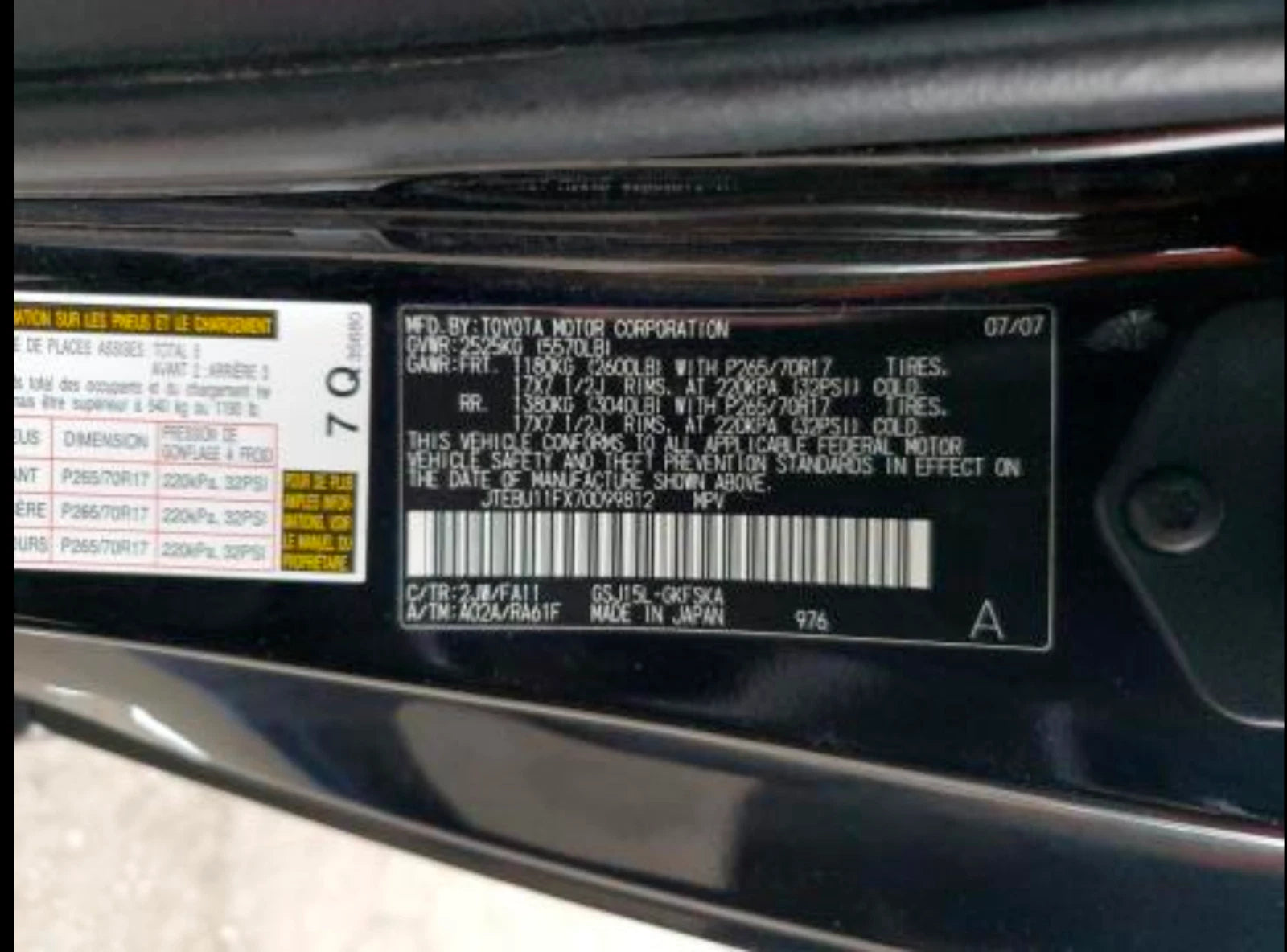2007 2008 TOYOTA FJ CRUISER 4WD WITH differential lock, 3.909 ratio (MT).